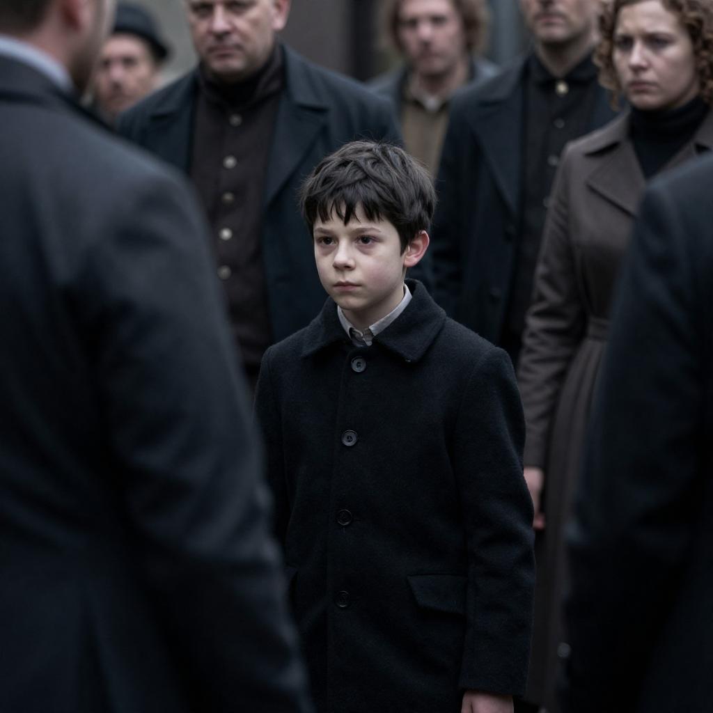 Photograph of a young boy with light skin and short brown hair, wearing a maroon beret, matching blazer, and dark shirt, raising both hands in a gesture of surprise or excitement. Background shows a smoky, industrial setting with blurred figures and dark, weathered buildings.