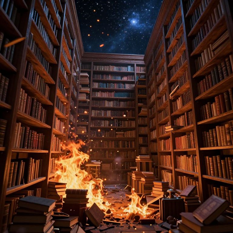 Photograph of a burning library with flames consuming stacked books between tall wooden shelves, under a starry night sky visible through the ceiling.