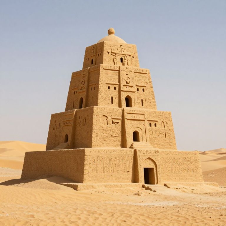 A towering sandcastle, intricately carved with hieroglyphic patterns and architectural flourishes, stands defiantly against the vast, desolate desert, its golden sands shimmering under a clear sky as if defying the passage of time.