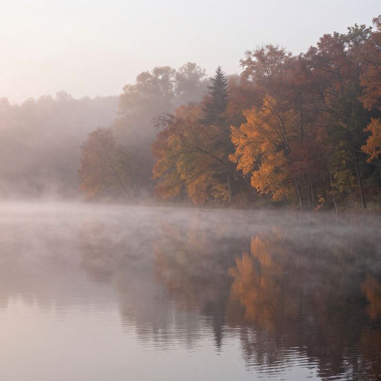Photograph of a misty autumn lake reflecting colorful trees with orange and brown leaves, soft morning light, and calm water surface.