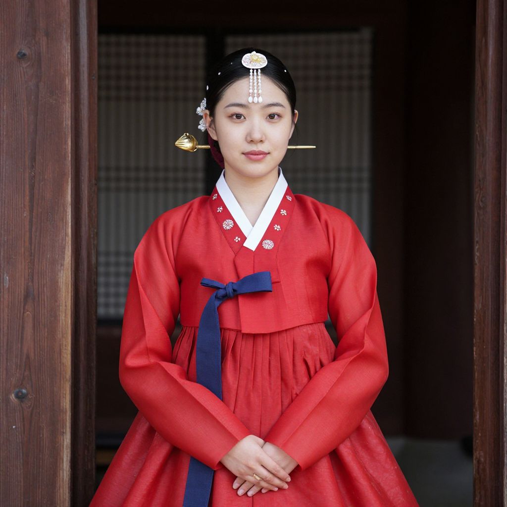 Photograph of an East Asian woman in traditional Korean red hanbok with white collar, black hair bun, and blue ribbon, standing in wooden doorway