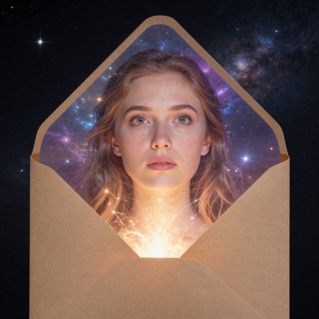 Enveloped by the cosmic embrace of her thoughts, the woman stands as a beacon of inner illumination, her mind alight with the boundless expanse of creativity and wonder, while the universe whispers secrets of eternity in the soft hum of celestial energy.