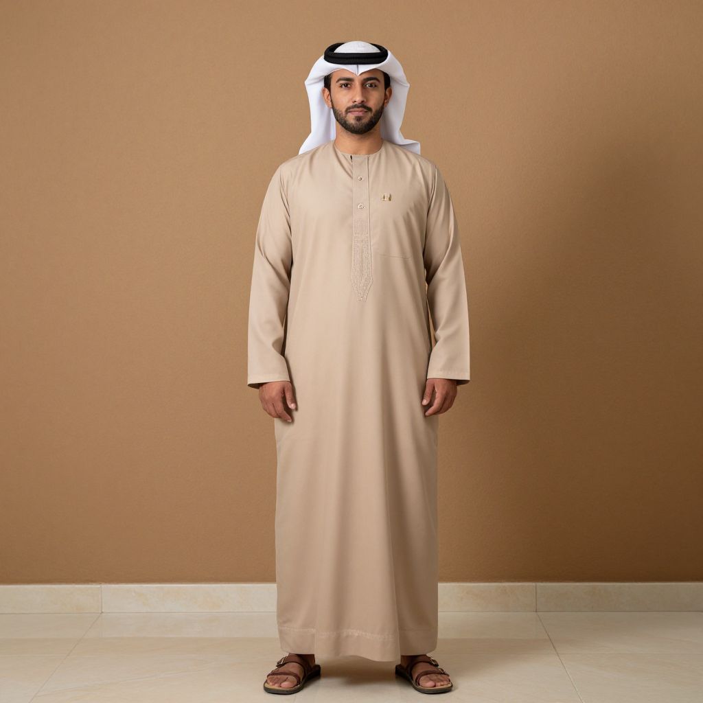 Photograph of a Middle Eastern man standing against a plain beige background. He has a medium build, light brown skin, and a trimmed beard. He wears a traditional beige thobe, long-sleeved and floor-length, with a white and black patterned kufi hat. His feet are in brown sandals. The floor is tiled in a light cream color. The man's expression is neutral, and he stands with his arms slightly away from his body, hands relaxed at his sides. The image is well-lit, with even lighting highlighting the simplicity and traditional style of his attire.