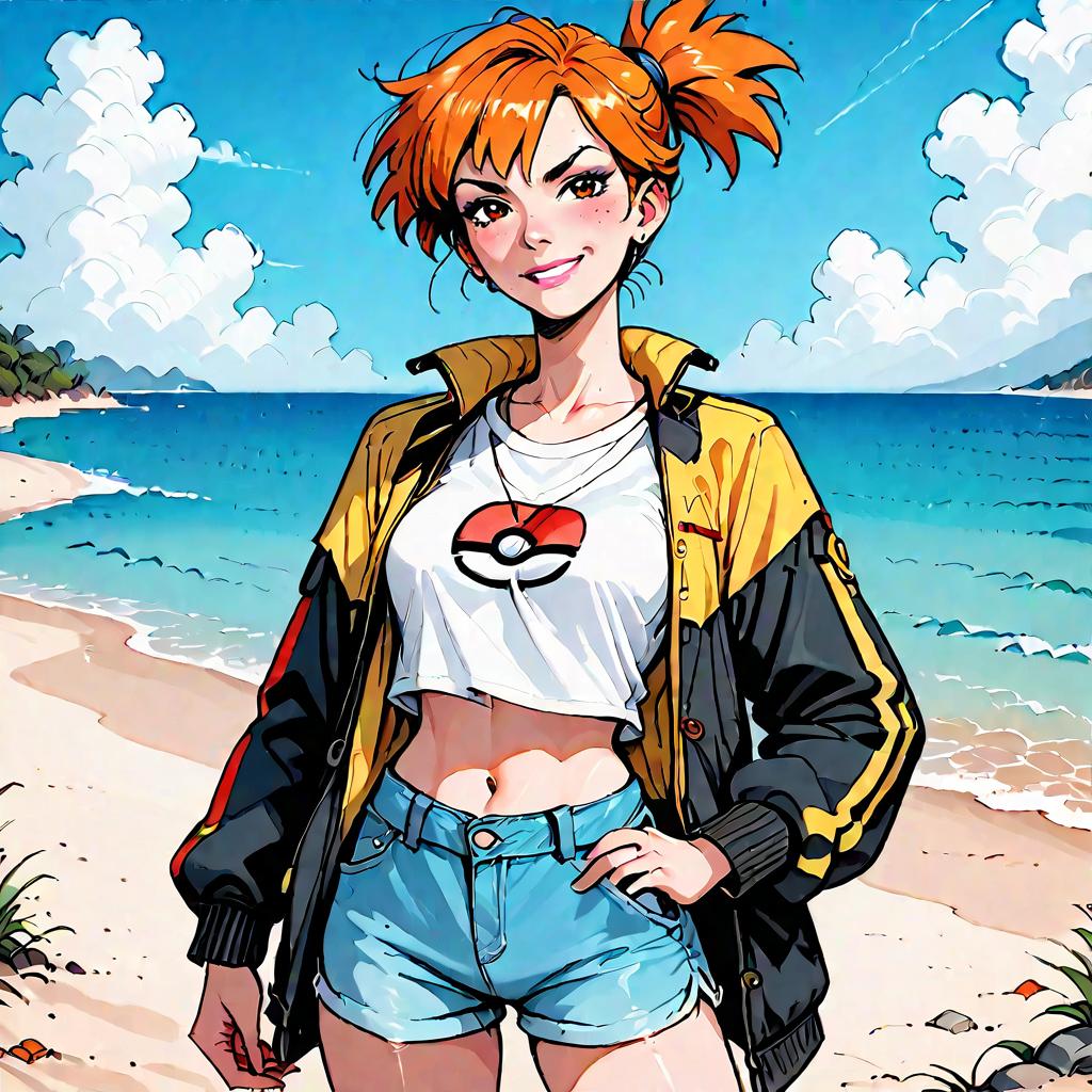 Score_9, score_8_up, score_7_up, score_6_up, score_5_up, score_4_up, , source_anime, 1girl, misty \(pokemon\), orange hair, wearing a yellow crop top and a short shorts, smirk, sea, blue sky, sand, marker \(medium\), traditional media