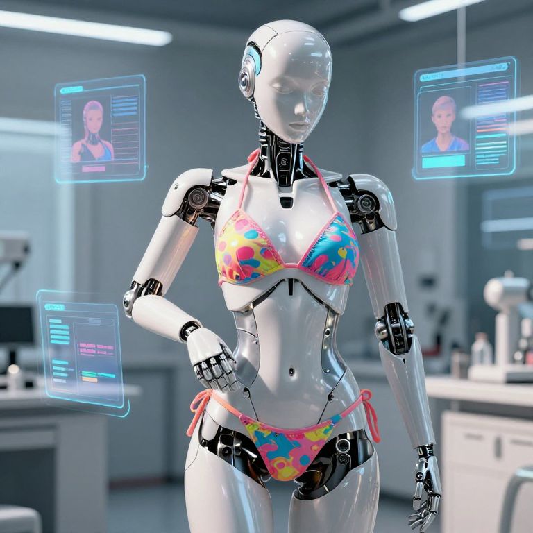 A digital CGI image of a sleek, white humanoid robot with a glossy finish, standing in a modern, brightly lit laboratory. The robot is wearing a colorful, patterned bikini with blue, pink, and yellow hues. Three holographic screens hover around the robot, displaying the face of a human woman with light skin and brown hair. The background features blurred laboratory equipment, including a microscope on the left and a counter on the right. The robot's joints and internal mechanisms are visible, emphasizing its robotic nature.
