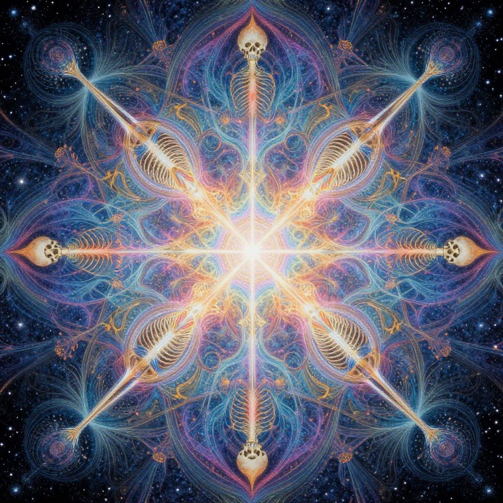 Psychedelic artist Alex Gray visionary art style, complex symmetry blending biology and sacred geometry, intricate mesh of light and color over human skeletons, radiant energy flows in kaleidoscopic patterns, dreamy, cosmic spiritual realm