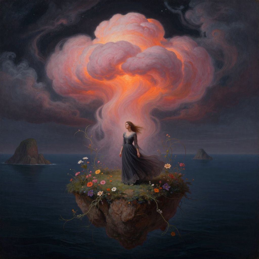The image is a surreal, oil painting that exudes an ethereal and magical atmosphere. A woman, dressed in a flowing, dark dress with intricate lace details, stands on a floating island adorned with vibrant flowers and delicate vines. The island is surrounded by a vast, dark ocean with rocky formations in the distance. Above the woman, a large, swirling cloud of pink and orange hues rises, casting a warm glow that contrasts with the cool, dark tones of the surrounding environment. The sky is filled with dark, billowing clouds, punctuated by a few stars, adding to the otherworldly ambiance. The overall composition is balanced, with the woman and the cloud formation centrally positioned, creating a sense of harmony and wonder. The interplay of colors, textures, and shapes creates a visually rich and dynamic scene that invites the viewer to explore the magical world depicted.
