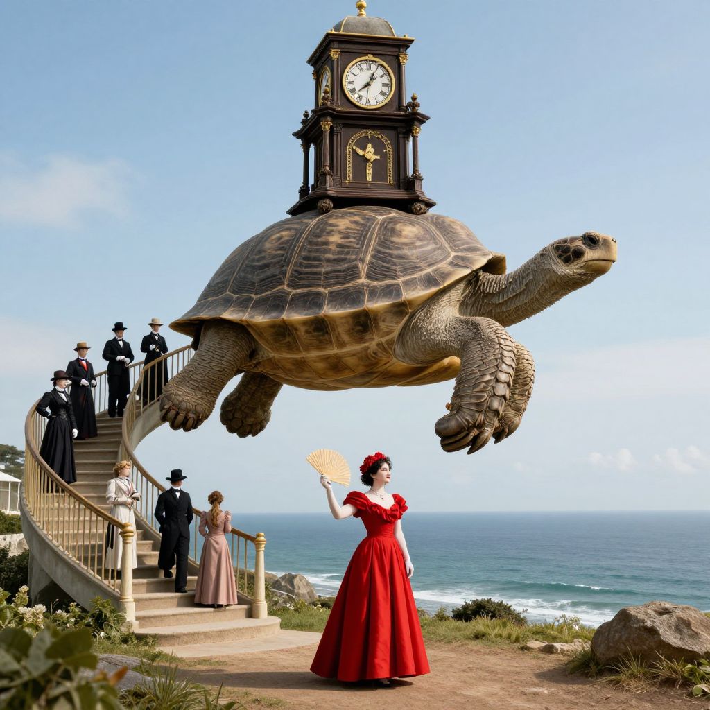 Levitating tortoise carries a grand clocktower on its shell, its spiral staircase bustling with Victorian-era figures in formal attire, while a woman in a vibrant red dress stands below, holding a fan, amidst a surreal coastal landscape under a clear sky.
