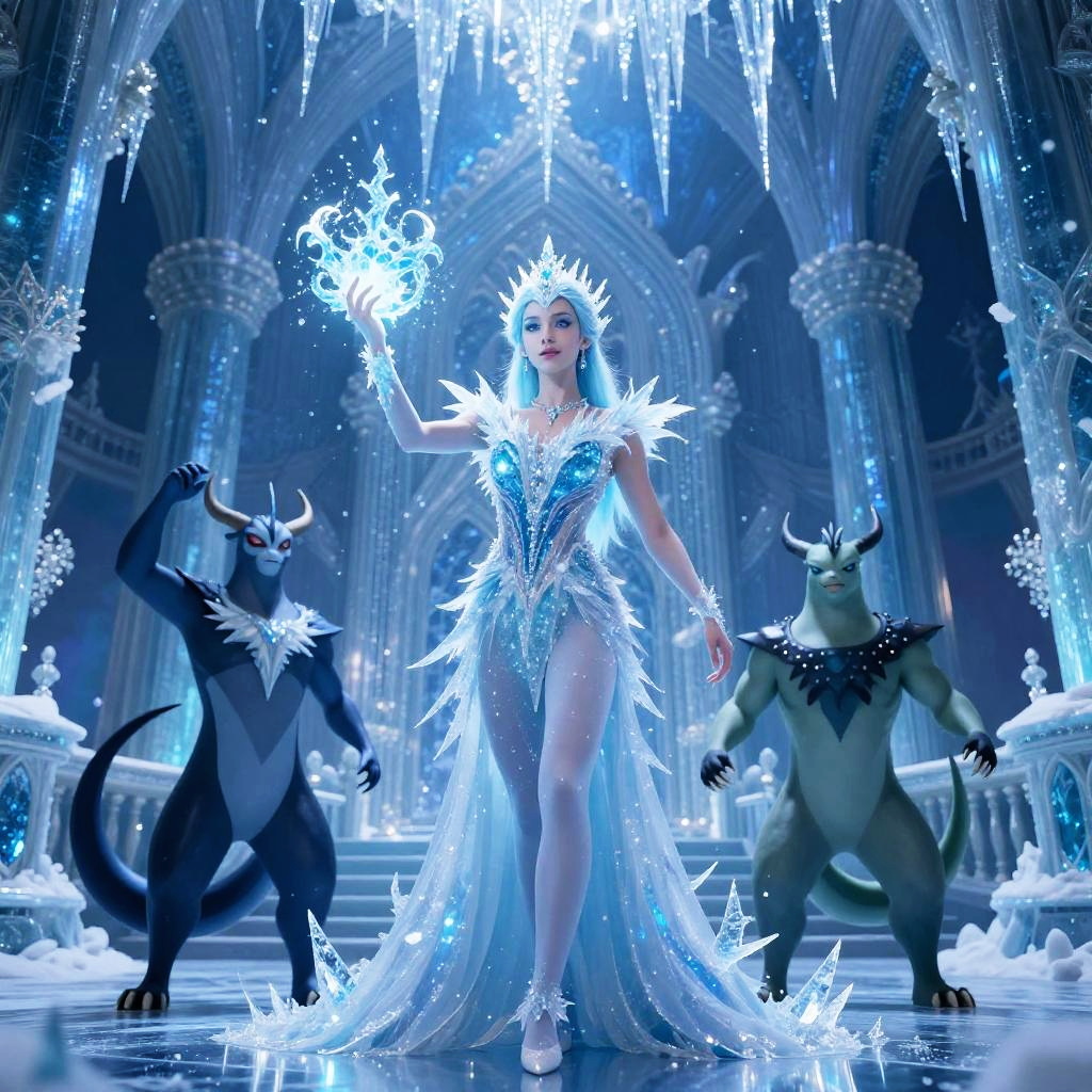 Ice type gym leaders in a mystical frozen palace, sparkling icicles hanging from the ceiling, leader wielding ice magic with a radiant aura, elegant and cold expression