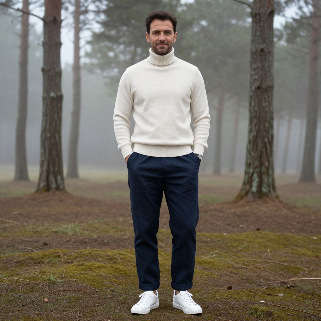 A man, cream lightweight turtleneck, navy linen trousers, white leather sneakers, casual chic, misty morning fog, towering pines, soft moss underfoot, camera obscura style, relaxed pose, slight smile, hands in pockets.Man has masculine face and piercing eyes