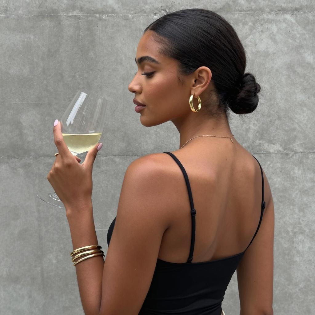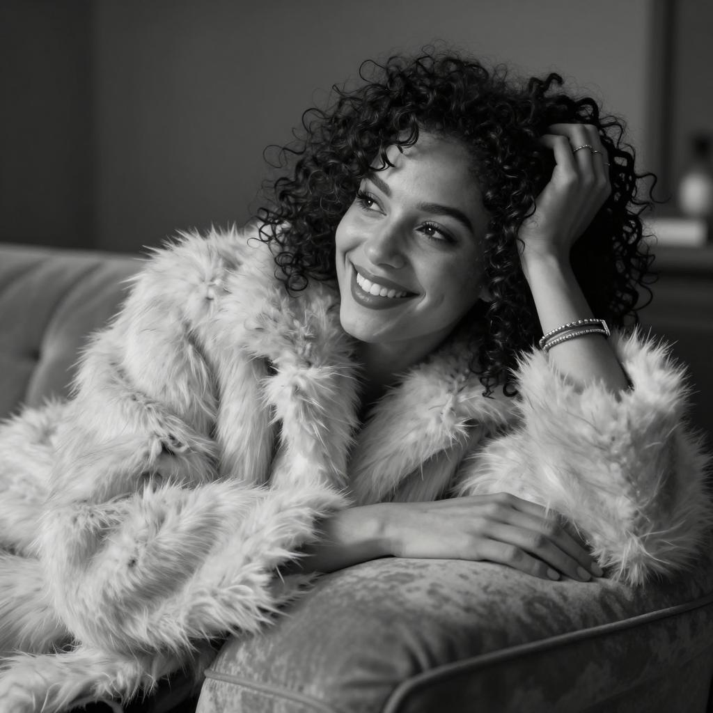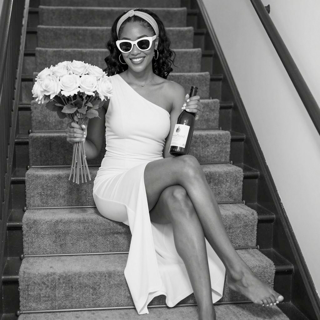Black and white photograph of a woman with dark skin, wearing white sunglasses, a white dress with one shoulder down, and a headband. She sits on carpeted stairs, holding a bouquet of white flowers in her left hand and a bottle in her right hand. Her dress is draped over her lap. She has a smiling expression. The stairs have a dark railing. Her legs are crossed, and she is barefoot.