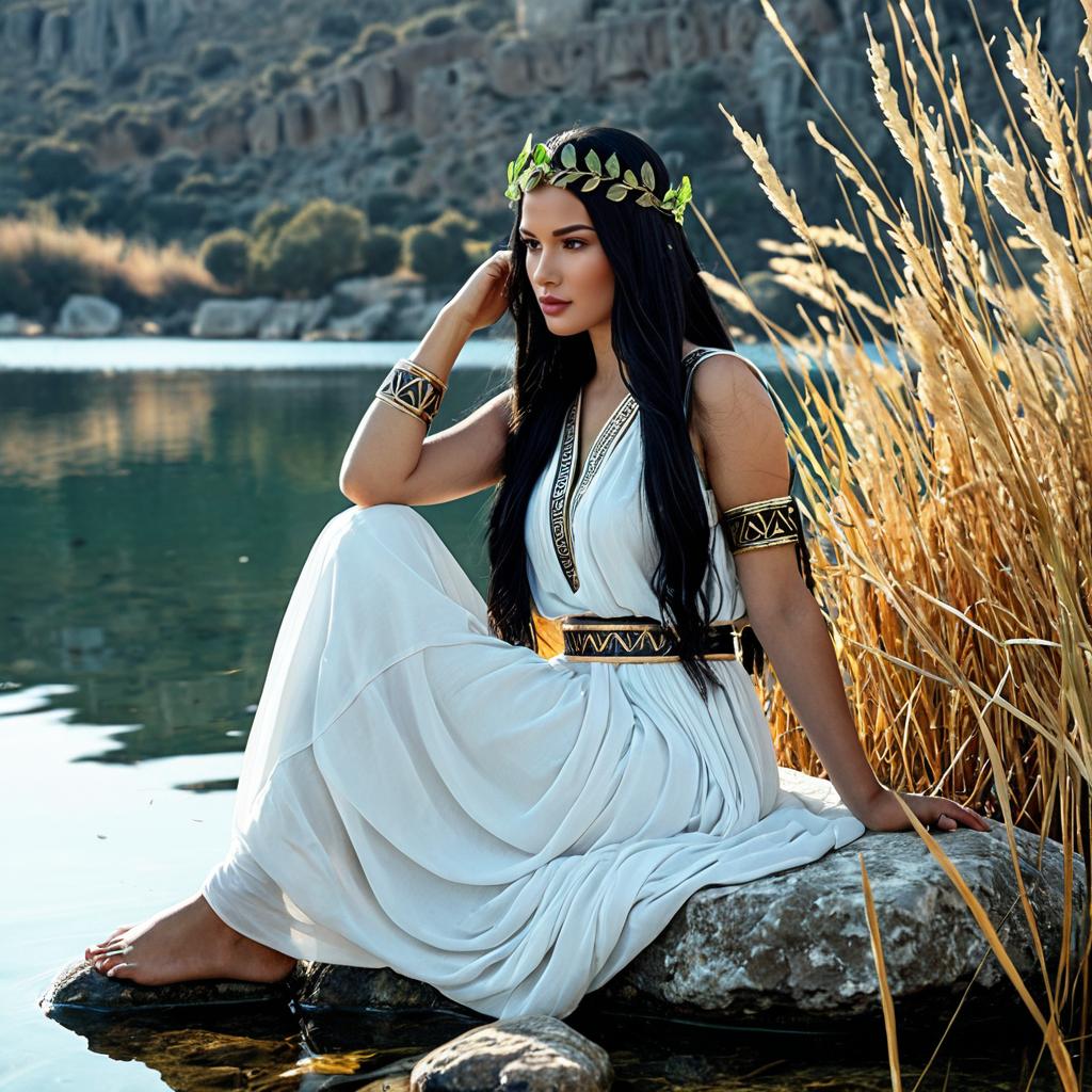 1girl, solo, greek clothes, peplos, laurel crown, armlet, sitting, outdoors, lake, rock, reeds, black hair, long hair