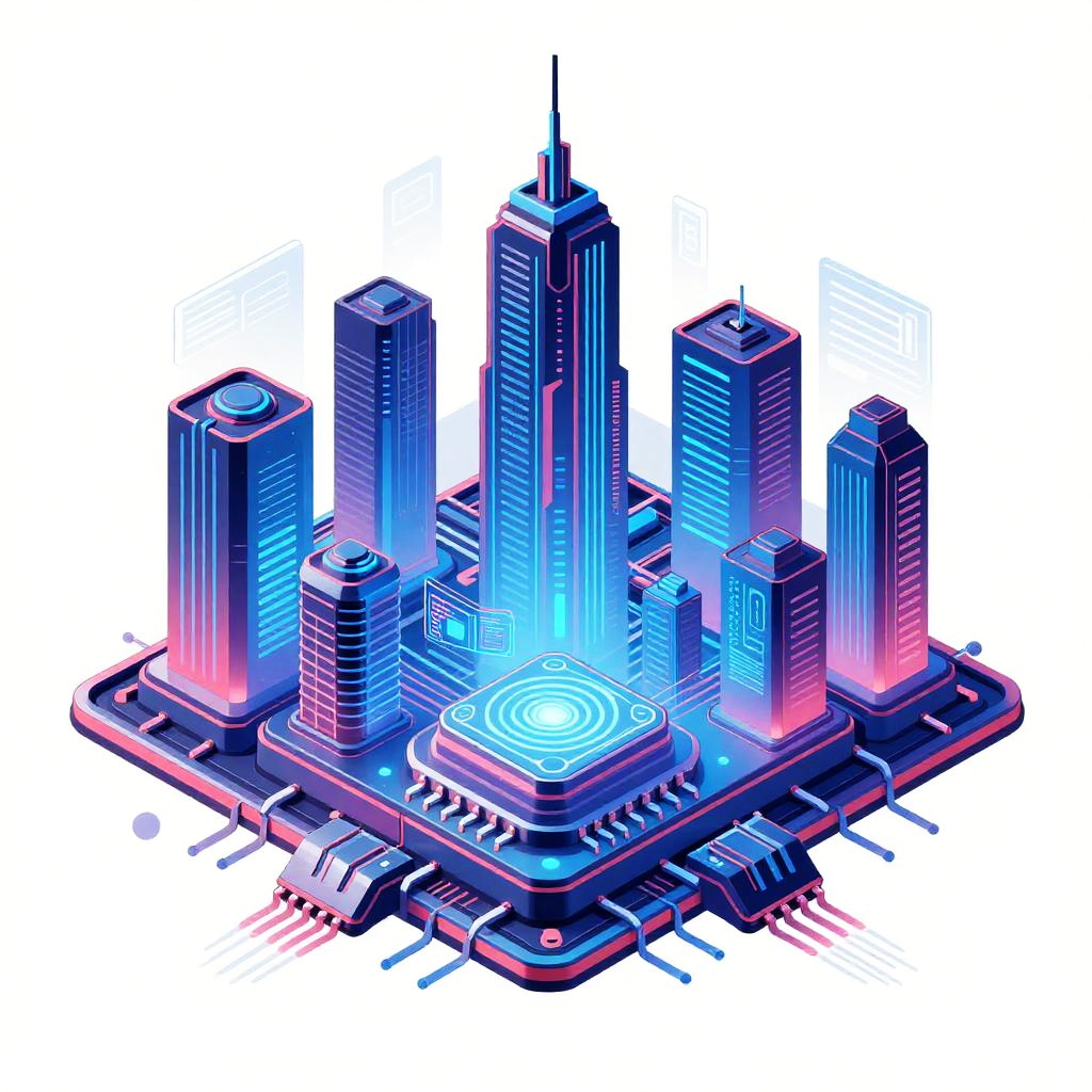Intelligence drawing of a futuristic cityscape powered by artificial intelligence, with buildings shaped like microchips and digital interfaces projected on surfaces, using a cyberpunk aesthetic with vivid blues, pinks, and metallic textures.