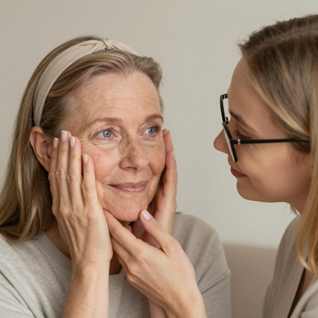 Close-up photograph of two women. The older woman with fair skin, light brown hair in a headband, and blue eyes has her hands on her face, smiling slightly. The younger woman with fair skin, glasses, and blonde hair gently holds the older woman's chin from the side. The younger woman's face is partially obscured. Both wear neutral clothing. The background is a plain, beige wall. The older woman is on the left, the younger woman on the right.