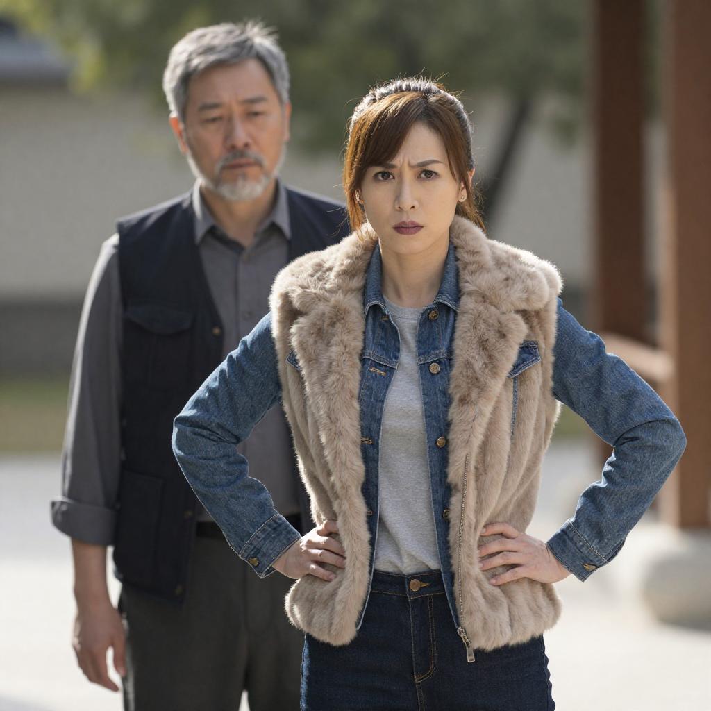 Photograph of two people outdoors. Woman with light brown hair in a ponytail, wearing a denim jacket, grey shirt, and beige vest with fur collar, hands on hips, intense expression. Older man with grey beard, wearing dark vest over grey shirt, standing to her left, looking downward. Background: blurry trees and wooden structure. Daylight.