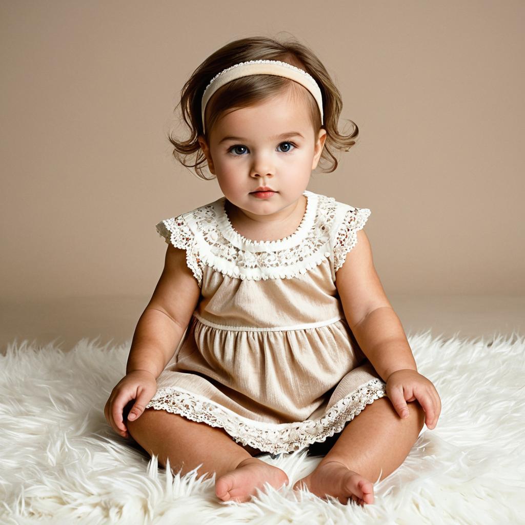 Woody infant costume, photorealistic, baby girl sitting on white fur rug, wearing beige dress with lace trim, brown headband, blue eyes, light brown hair, serious expression, soft lighting, studio background, adorable, infant fashion, detailed ures, cozy atmosphere