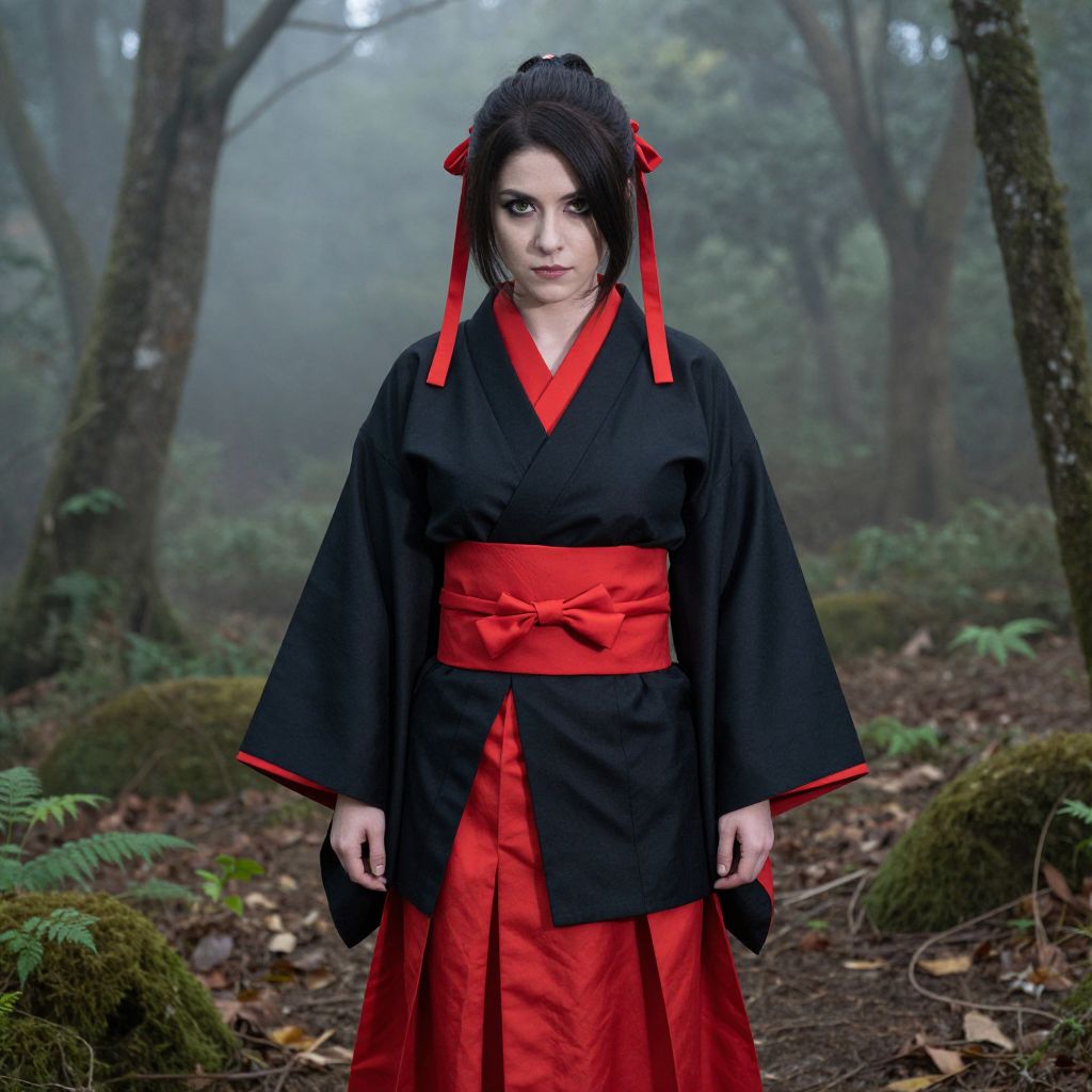 Photograph of a pale-skinned woman with dark hair in a traditional black and red kimono, standing in a misty forest.
