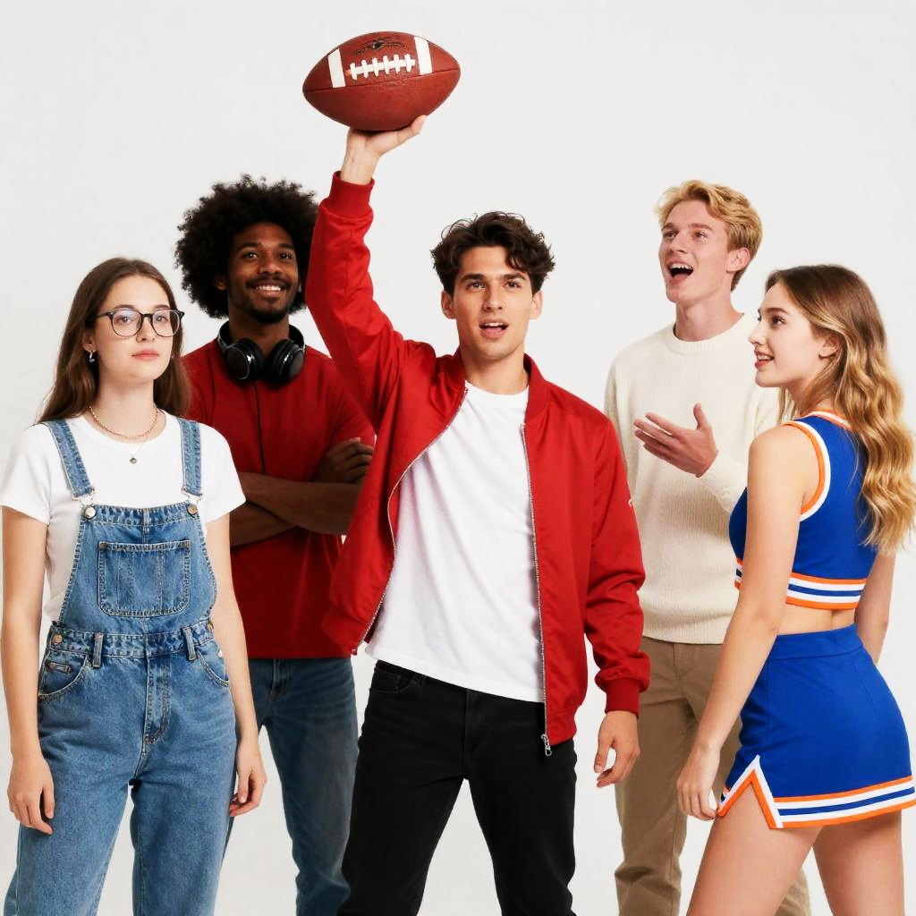 Photograph of six people in casual and cheerleader attire. Central man with dark hair, red jacket, and raised arm holds football. Man with afro, red shirt, and headphones smiles. Woman with glasses, blue overalls, and necklace looks forward. Blonde man with white sweater gestures. Cheerleader with long blonde hair, blue and orange cheerleading outfit turns back. White background. Intense and joyful facial expressions. Football in central man's hand. Group standing closely together.