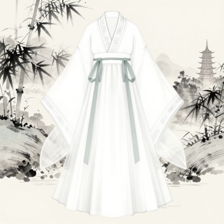 White hanfu with flowing layers depicted in a traditional Chinese ink painting style, detailed brush strokes emphasizing the texture of the fabric and patterns, set against a minimalist landscape of bamboo forests and distant pagodas, combining classic art with fashion.