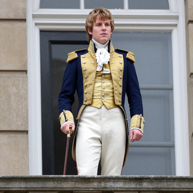 Bridgerton Outfit, boy in blue and gold jacket standing on a balcony with a cane