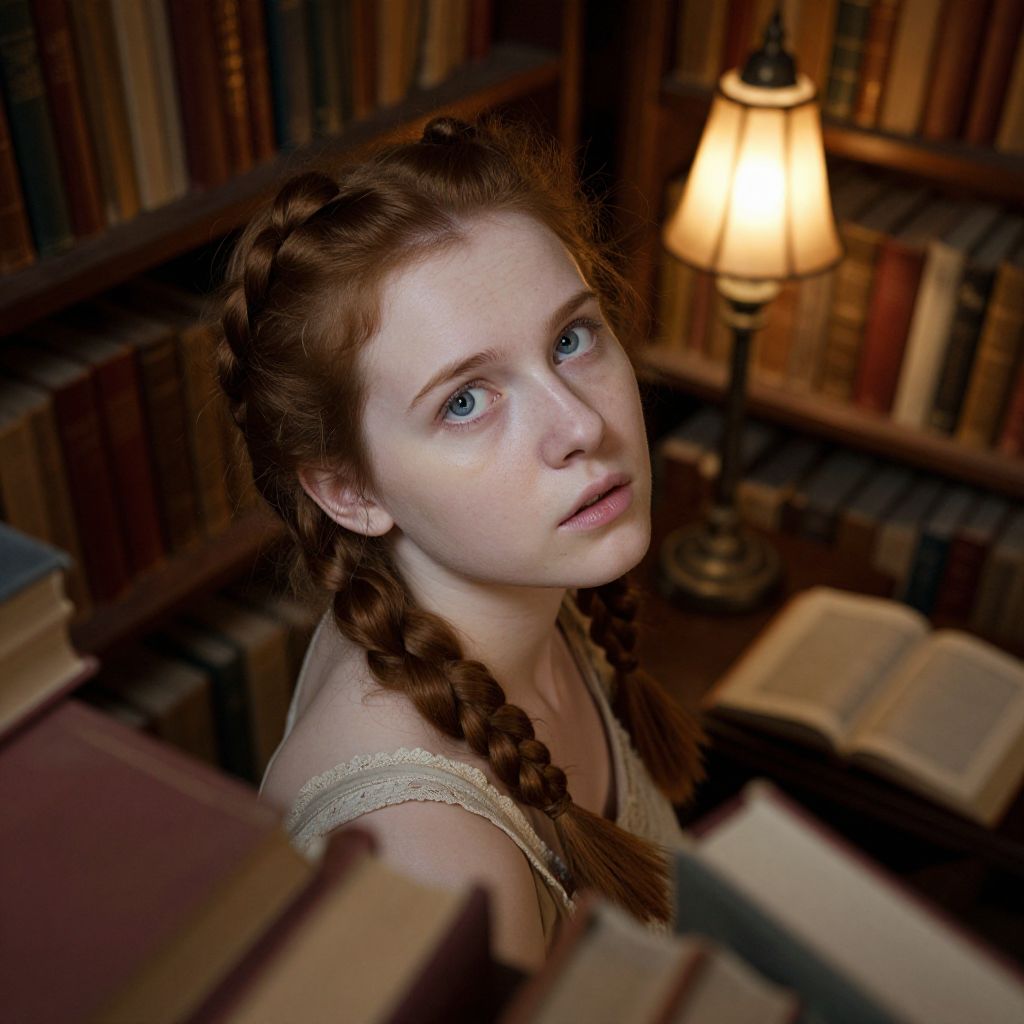 A photorealistic portrait captures the enigmatic gaze of an Eastern European woman. She has alabaster skin and piercing blue eyes, illuminated by warm antique reading lamps that cast soft shadows and highlight subtle imperfections on her porcelain complexion. From a bird's-eye view, the intricate braids of her chestnut hair and the play of emotions on her face as she gets lost in thought among towering shelves of leather-bound books are the focal points. The vintage library setting, with its dim lighting, adds to the sense of curiosity, introspection and intellectual intrigue.