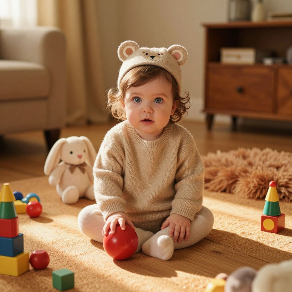 A baby girl with soft, curly brown hair that gently frames her face, and large, curious blue eyes that sparkle with wonder, is wearing a cozy beige sweater with a small embroidered bear hat on her head. She is sitting cross-legged on a warm, natural wood playmat in a sunlit living room filled with golden afternoon light, soft ambient lighting casting gentle shadows. Around her are a variety of colorful toys — including a red ball, a stuffed rabbit, and a stack of building blocks — scattered thoughtfully on the floor, and a plush, fluffy rug in earthy tones adds to the cozy atmosphere. The room has a warm, inviting feel with a mix of vintage furniture and modern simplicity, emphasizing comfort and innocence. The overall scene is gentle, heartwarming, and captures the pure joy, curiosity, and charm of early childhood.