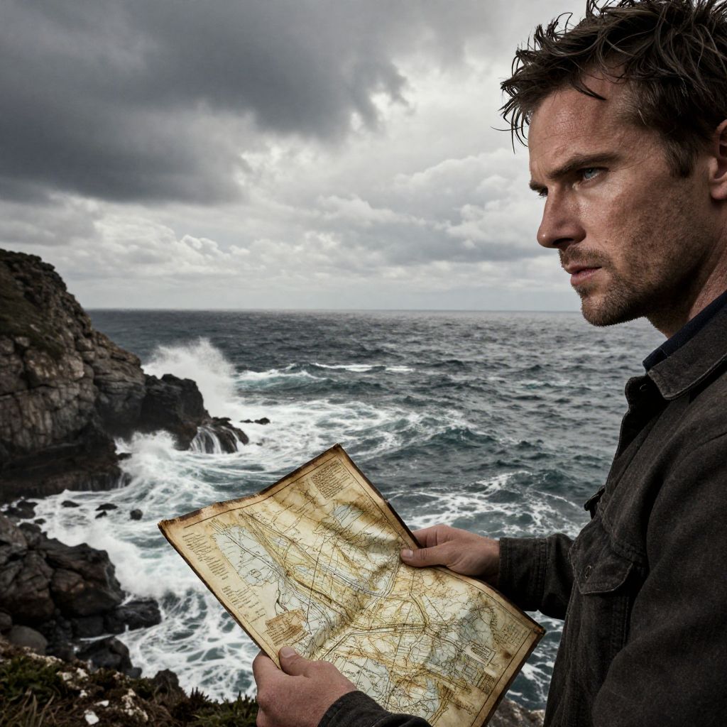 Photograph of a rugged, mustachioed man with tousled hair, holding an aged map, standing on a rocky coastal cliff with stormy