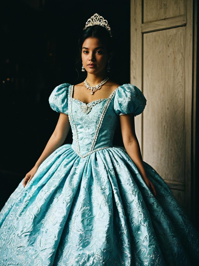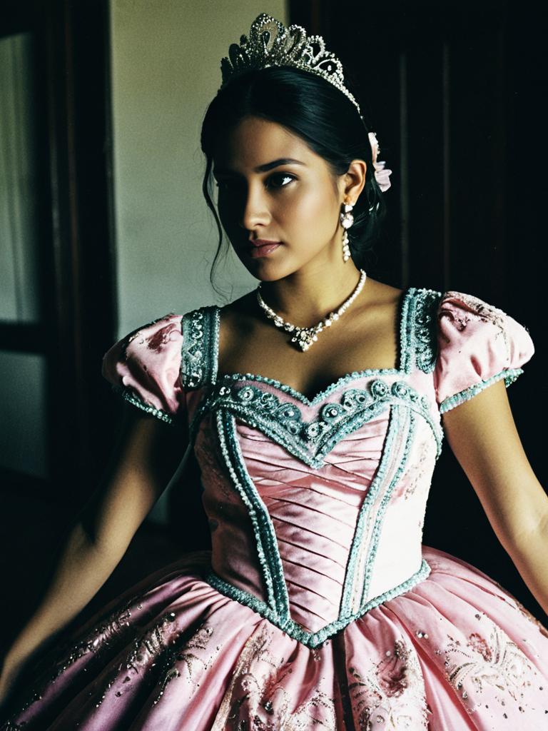 Woman in Quinceañera Dress costume, cinematic realism, detailed textures