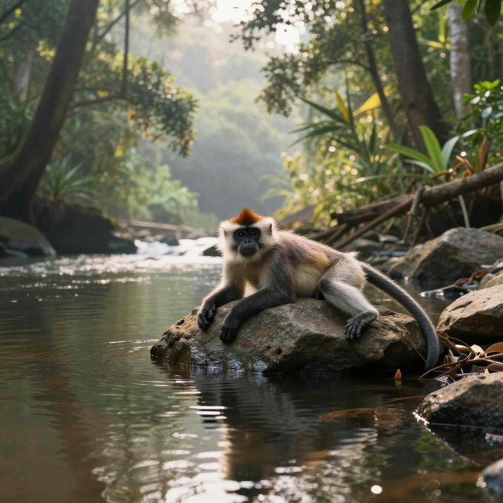 Brooke monkey swinging through lush tropical rainforest, vibrant green leaves, dynamic motion, sunlight filtering through canopy, hyper-realistic detail, cinematic atmosphere