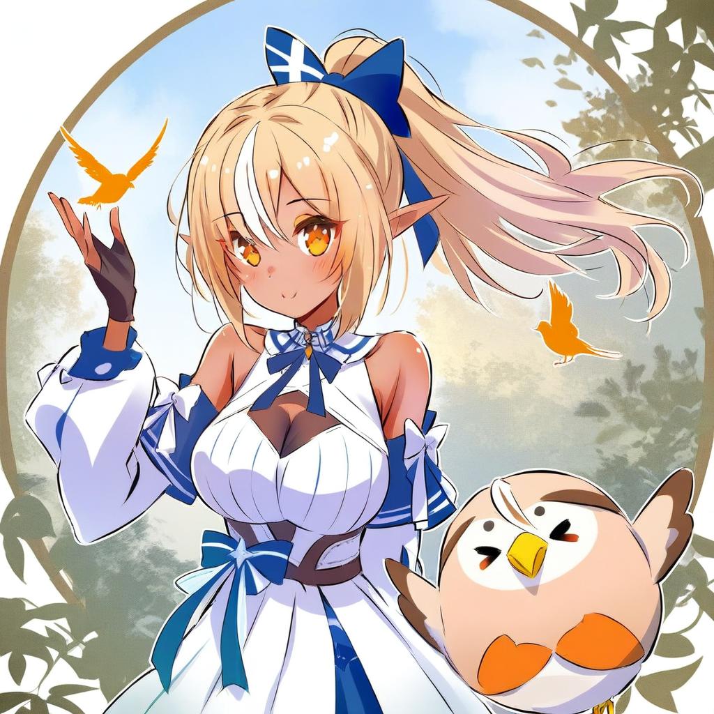 Elfriend (shiranui flare), hololive, 1girl, dark-skinned female, red eyes, orange eyes, streaked hair, blonde hair, long hair, white hair, sidelocks, ponytail, high ponytail, hair bow, large breasts, cleavage, white dress, blue bow, bare shoulders, detached sleeves, long sleeves, virtual youtuber, virtual youtuber, elf, bird, dark elf, by artist iesupa, animagine