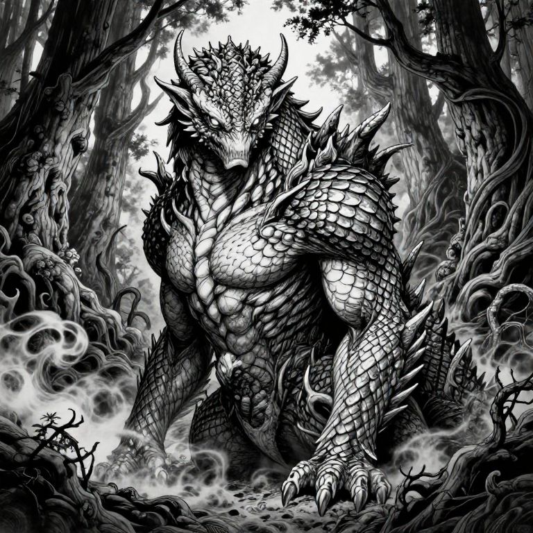 Kentaro Miura art style mythical creature in a dense dark forest, highly detailed scales and muscles, eerie glowing eyes, complex line shading emphasizing form and depth, surreal atmosphere with swirling mist and twisted ancient trees, finely drawn background elements