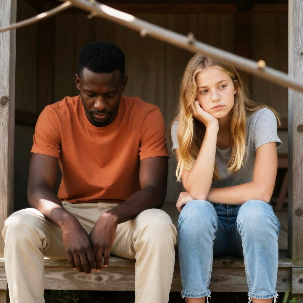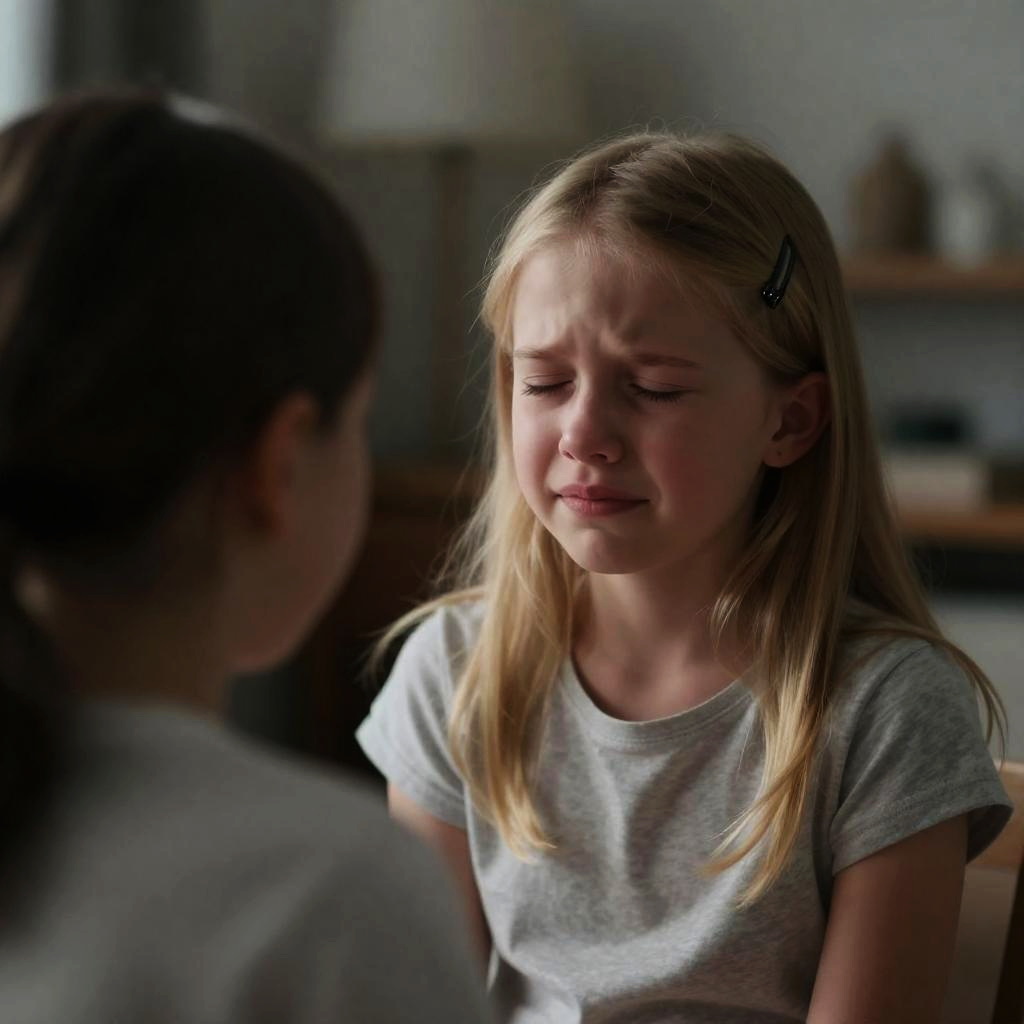 Photograph of a young girl with light brown, shoulder-length hair, wearing a blue, ribbed sweater, and a silver necklace. She looks down with a slight frown, sitting next to a window. Soft light illuminates her face from the left.