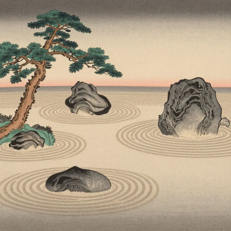 Craft an image reminiscent of traditional Japanese woodblock prints, depicting a serene Zen garden viewed from a low-angle perspective that highlights its intricate details. The scene showcases a meticulously raked sand landscape dotted with smooth rocks and small trees, employing subtle color gradations and lighting to suggest the passage of time. The composition conveys a sense of peace and contemplation, inviting the viewer to immerse themselves in the calming atmosphere of this meticulously arranged space.