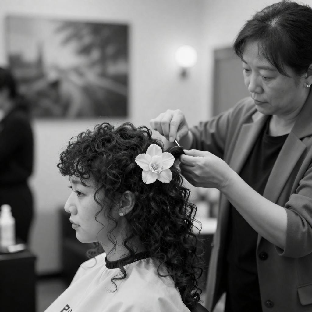 Black and white photograph of a woman with curly hair and a flower in her hair being styled by an older woman in a jacket. The older woman focuses on the younger woman's hair, with gentle expressions. Background includes blurred wall art and light fixtures. Two people, indoor setting.