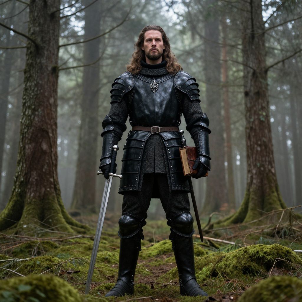 A photograph of a tall, serious-looking man with long brown hair and a beard, standing in a dense forest. He's wearing shiny black medieval armor with a sword in his right hand and a leather-bound book in his left. The forest is misty with tall trees and green moss covering the ground. His determined expression and poised stance add to the epic, fantasy vibe.