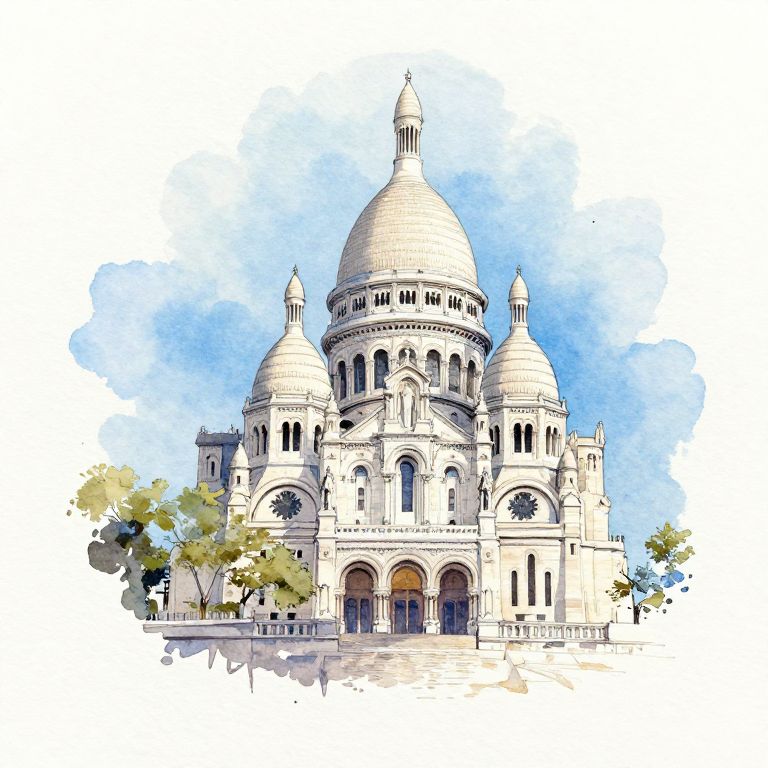 Conductor minimalist watercolour sketch drawing, detailed, beautiful, Paris Montmartre, in soft and bright blue and beige,