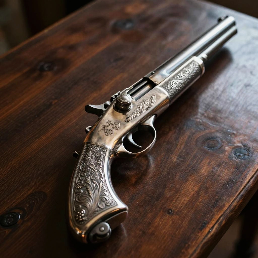 Silver plated gun on a dark wooden table, intricate engravings on the metal, dramatic lighting highlighting the reflective surfaces, vintage style, hyper realistic detail