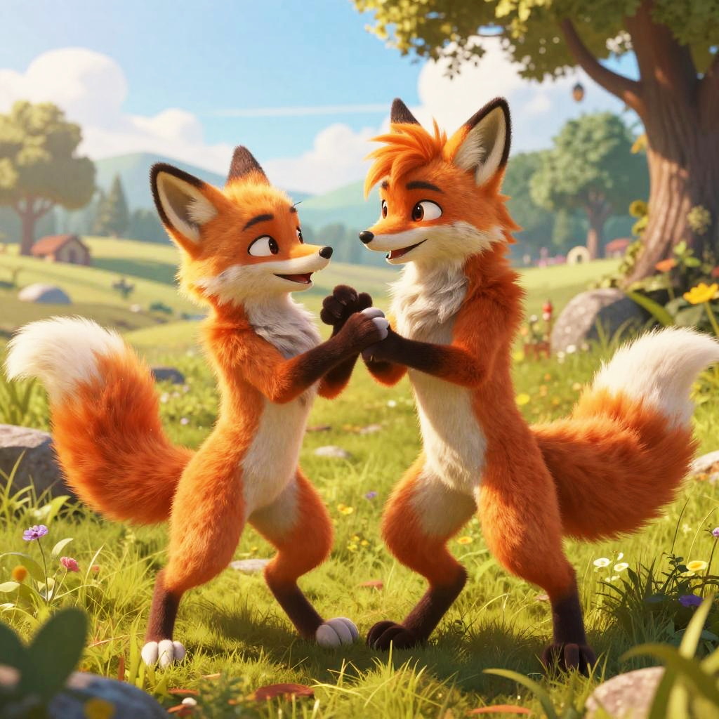 Stable diffusion yiff scene featuring two colorful fox anthros playfully interacting in a sunlit meadow, rich details, warm tones, and a whimsical fantasy background.