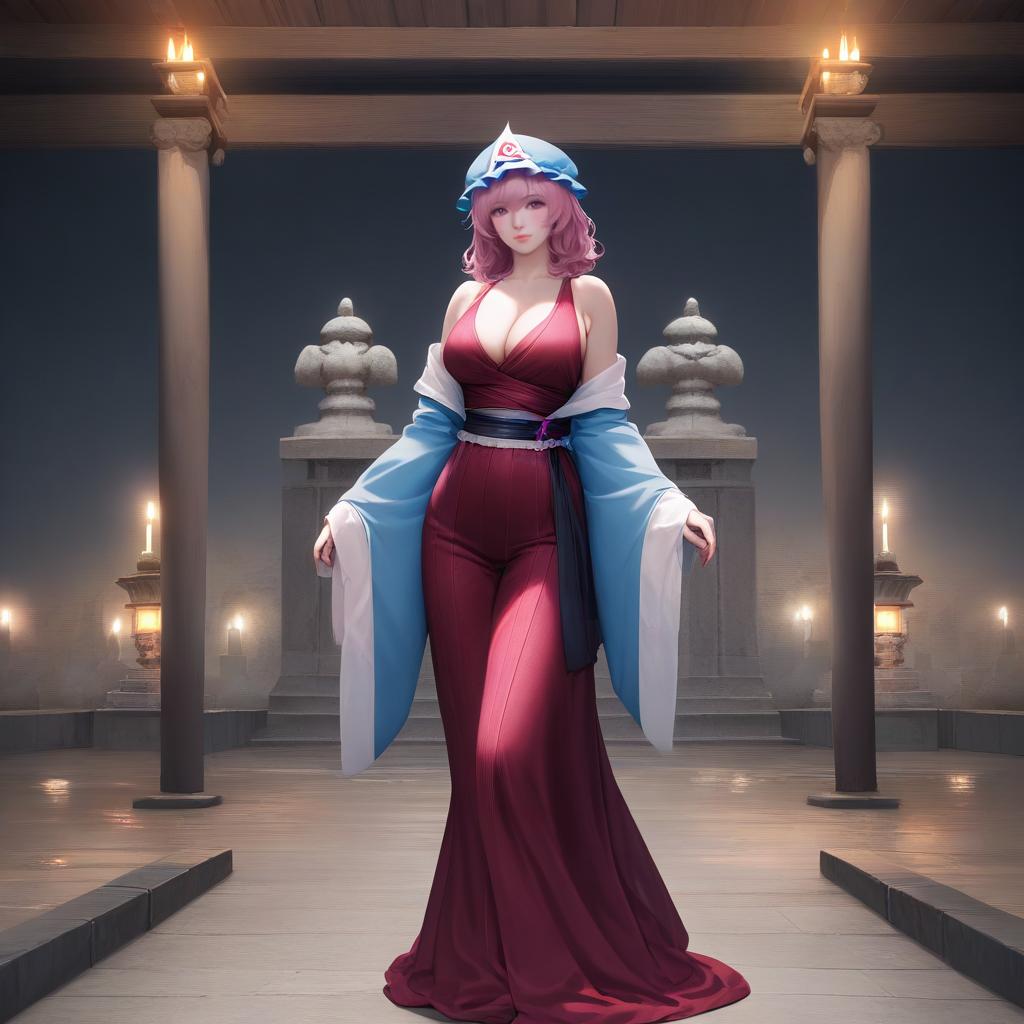 Saigyouji yuyuko, touhou, 1girl, pink eyes, pink hair, short hair, large breasts, blue kimono, hat, mob cap, triangular headpiece, realistic style, character, dark hair, long hair, purple eyes, curvy anatomy, confident pose, digital art style, summer vibe, soft lavender blouse and skirt, urban rooftop, sunset glow, city lights