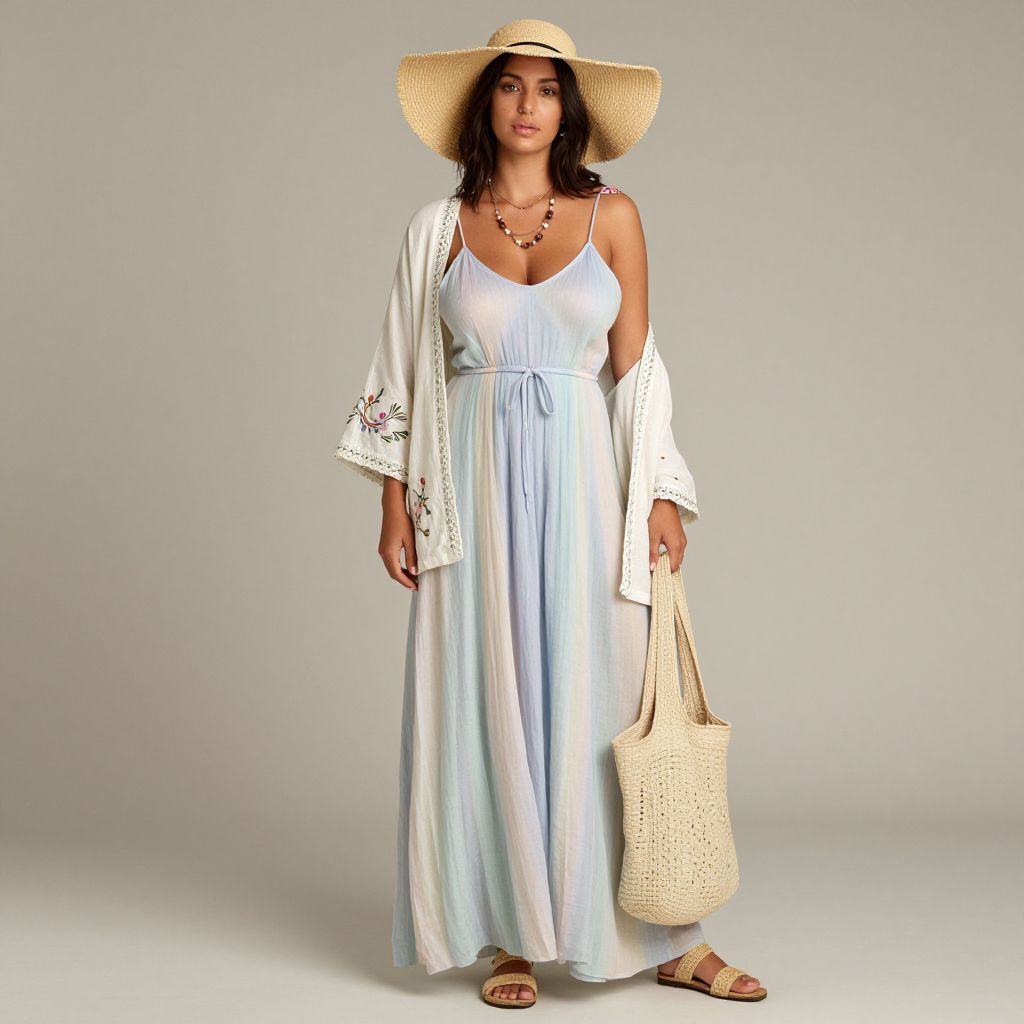 Full body shot, woman, flowing organic cotton maxi dress, soft pastel colors, adjustable spaghetti straps, cinched waist, lightweight linen kimono jacket, intricate floral embroidery, wide-brimmed straw hat, natural raffia sandals, eco-friendly materials, delicate beaded jewelry, oversized tote bag, sustainable fashion, relaxed beach vibe Sexy. Pretty face and beаutiful eyes. Big breasts
