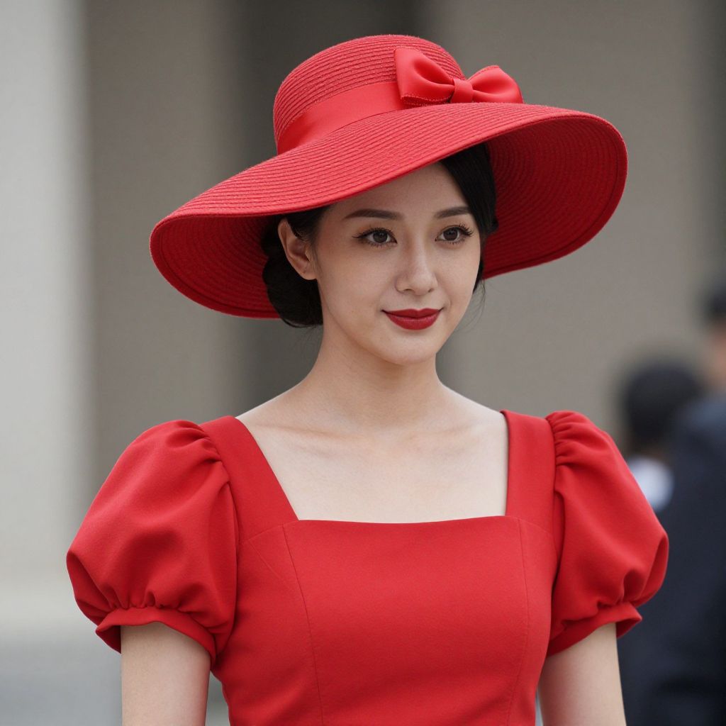 Photograph of an Asian woman with fair skin, wearing a vibrant red dress with puffed short sleeves and a square neckline. She has dark, straight hair partially visible under a large, bright red, wide-brimmed hat adorned with a matching red bow. Her makeup includes bold red lipstick, and she looks directly at the camera with a subtle smile. The background is slightly blurred, featuring neutral tones and indistinct figures, likely outdoors. The image emphasizes her elegant and stylish appearance, with a focus on the striking red color scheme of her outfit and hat.