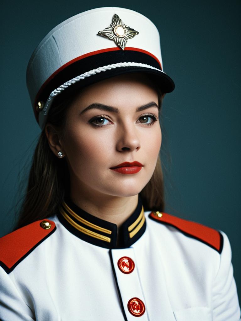 Close-up portrait of a young woman wearing a photorealistic majorette uniform featuring a white and navy blue jacket with gold buttons and a matching hat with decorative insignia. The subject has light skin, wavy blonde hair, and red lipstick, set against a dark background.