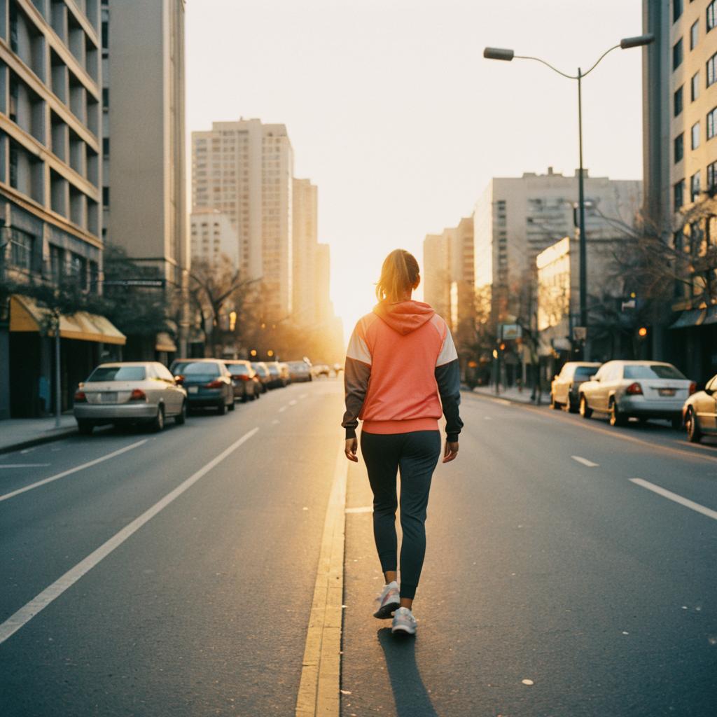 Rear view of a jogger wearing a bright orange tank top and black leggings running through a narrow alley illuminated by vibrant neon signs and warm glowing windows, set in a futuristic cityscape at dusk with vivid orange and pink hues.