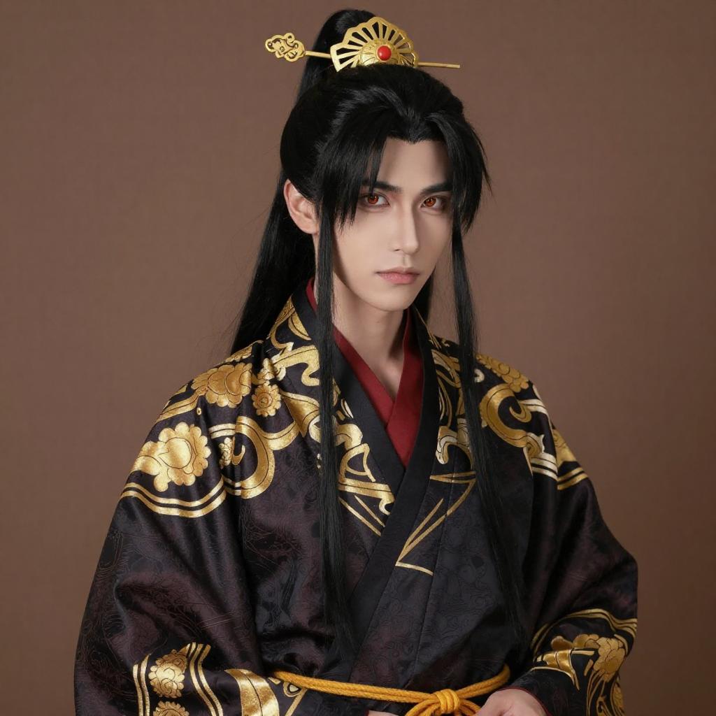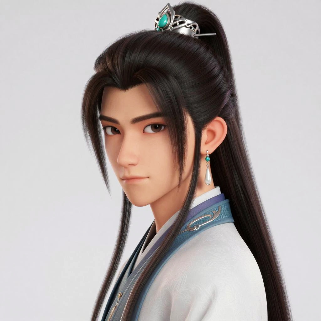 Masterpiece, (masterpiece, top quality, best quality), (((realistic))), (3d:1.2), jewelry, long hair, earrings, (1boy:1.3), male focus, solo, hair ornament, ponytail, looking at viewer, chinese clothes, upper body, black hair, from side, brown hair
