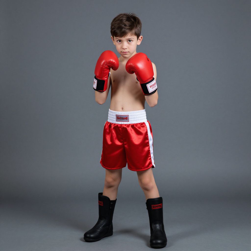 "boy boxing outfit costume, boxing gloves, 1boy, solo, male focus, boots, brown hair, shorts, standing, parody, full body, child Realistic photo of casual sexy person with pretty face"