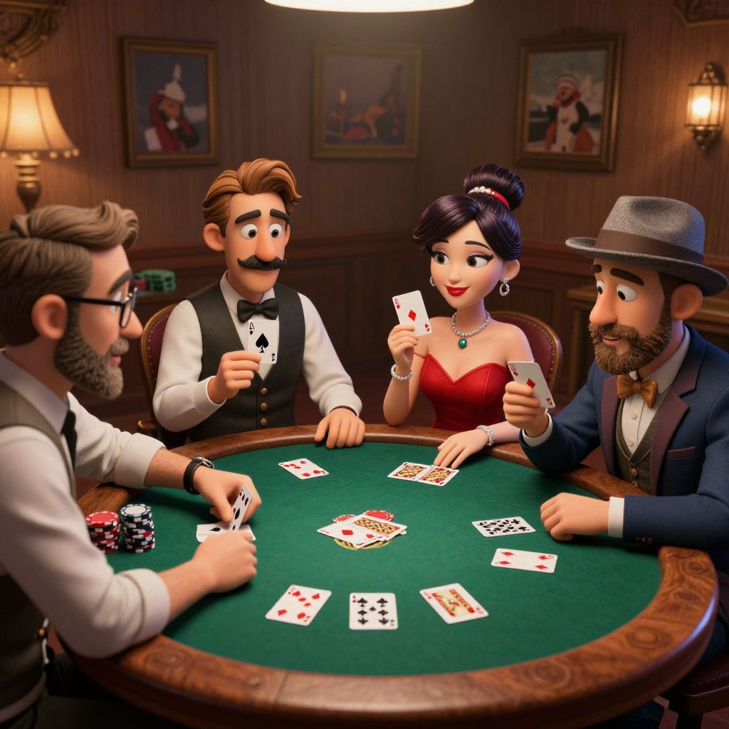 In this highly detailed and realistic 8k image, four cartoon characters are engrossed in a game of poker at a wooden table. The characters, each with distinct facial features and attire, are seated around the table, which is covered with a green felt surface. The man on the left, with a beard and glasses, is holding a card with a spade, while the man next to him, sporting a mustache and a vest, has a club card. The woman, with a bun and a red dress, is holding a heart card, and the man on the right, wearing a hat and a beard, has a diamond card. The table is scattered with various playing cards, including hearts, diamonds, clubs, and spades. The background features a warm, dimly lit room with wooden walls adorned with framed pictures and a lamp casting a soft glow. The overall composition is balanced, with the characters and cards arranged in a way that draws the viewer's eye across the scene, capturing the essence of a lively poker game.