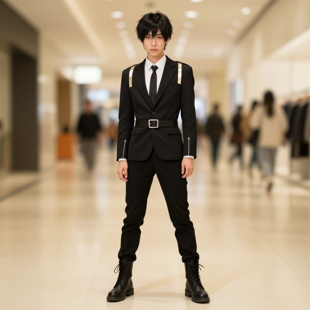 Photograph of an Asian man with short, messy black hair, standing confidently in a bright, modern hallway. He wears a sharp, black, double-breasted suit with white stripes down the sleeves, a black tie, and a black belt with a silver buckle. His black boots have laces. The background is blurred, showing indistinct people and a well-lit corridor with beige walls and a glossy floor. The man's serious expression and poised stance suggest confidence and determination. The overall style is contemporary and formal.