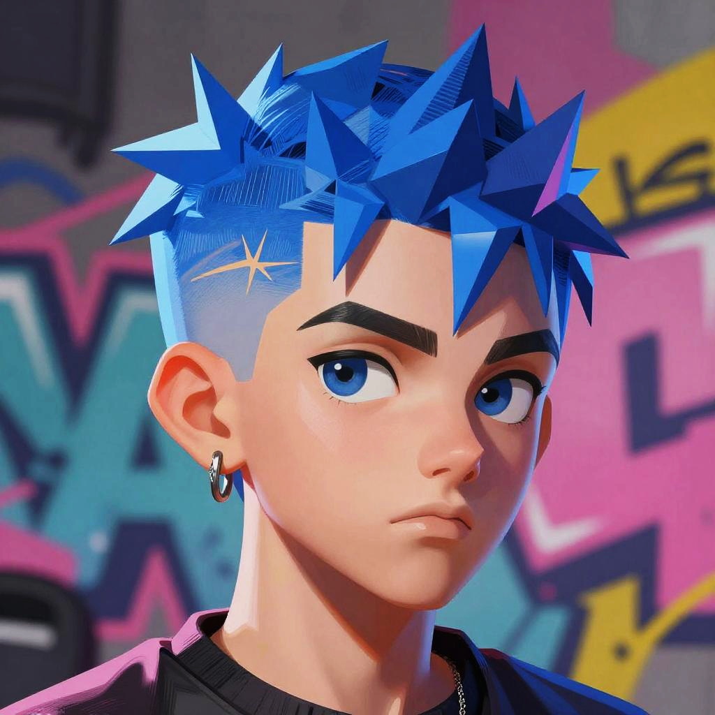 Close-up of a skibidi haircut in a high-detail digital painting, exaggerated geometric shapes, bright colors with pops of electric blue and pink, artistic graffiti background, edgy and modern street style vibe