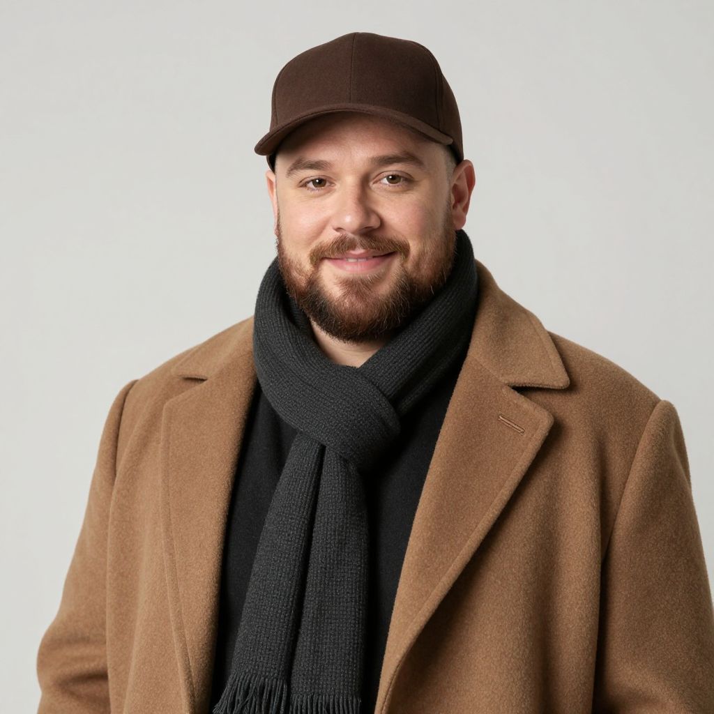 Big daddy costume adam, 1boy, male focus, solo, hat, beard, realistic, facial hair, smile, scarf, upper body, looking at viewer, brown headwear, coat, simple background, brown coat