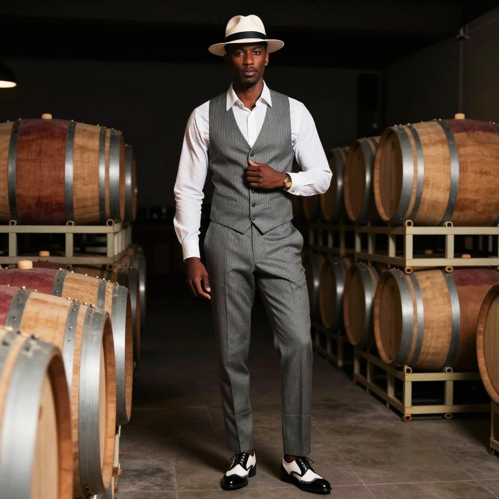 Photograph of a tall, dark-skinned man standing in a dimly lit wine cellar. He's wearing a white pinstripe shirt, grey pinstripe vest, and matching trousers, paired with black and white wingtips. He also sports a white fedora with a black band. In the background, there are large wooden barrels stacked on metal racks. He has a confident stance, with one hand adjusting his vest. The overall vibe is stylish and sophisticated.